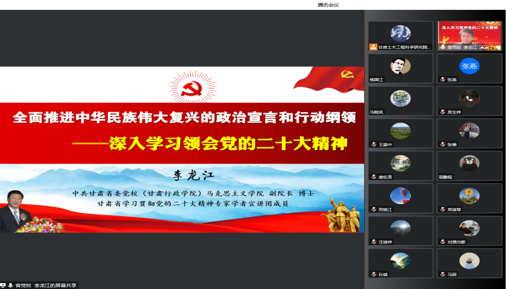 12月14日,甘肃土木工程科学研究院有限公司以视频集会形式召开党委理论学习中心组学习(扩大)集会暨党的二十大精神专题培训领导讲座。党委副书记、监事会主席、工会主席张磊主持集会,领导班子成员、全体党员、中层干部、入党积极分子加入。