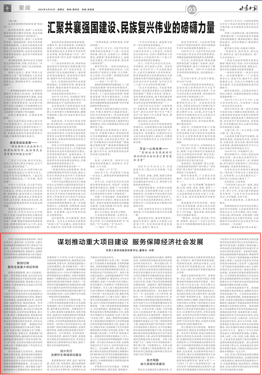 »¤º½ÖØ´óÃñÉúÏîÄ¿½¨Éè¡£ÔÚÍÆ½øÈ«Ê¡ÐÂÐͳÇÕò»¯¡¢¶¼»á¸üС¢º£Ãà¶¼»á¡¢³ÇÕòÀϾÉÐ¡Çø¸ïкÍÉçÇø½¨Éè¡¢°ü¹ÜÐÔס·¿¡¢ÏçÕò¾ÓªÐÔ×Ô½¨·¿¼°Å©´åΣ·¿¼ø¶¨ÖмÌÐø¼¼ÊõÖ÷Á¦¡£Ç£Í·ÊµÊ©À¼ÖÝ¡¢ÌìË®µÈ¶àµØÀϾÉÐ¡ÇøµÄάÐÞ¸ïÐÂ×ܳаüÏîÄ¿£»½ÓÄÉÐÐÒµÁìÏȵĿÓʽ¾²Ñ¹×®¼Ó¹ÌºÍ¶¥Éý·¨¾ÀÆ«¼¼Êõ¶ÔÀ¼ÖÝÊиÊÄÏ»¨Ô°Ð¡Çø×¡Õ¬Â¥½øÐоÀÆ«¼Ó¹Ì¸ïУ»µ£¸ºÇìÑô¡¢Æ½Á¹¡¢ÌìË®µÈ¶à¸öº£Ãà¶¼»á½¨ÉèÏîÄ¿Éè¼ÆÈÎÎñ£¬»ýÀÛÁ˽ÏΪ¸»ºñµÄº£Ãà¶¼»á½¨Éè¾Ñé¡£ÔöǿҽÁÆ¡¢½ÌÓýÁìÓò½¨ÖþÉè¼Æ¼¼ÊõÑо¿£¬·¢»ÓÊÐÕþ¹©Èȼ¼ÊõÓÅÊÆ£¬ÖúÁ¦°ü¹Ü¸ÄÉÆÃñÉú¡£Éè¼Æ½¨³ÉÀ¼ÖÝÊÐʮһÖС¢±±¾©ÊµÑé¶þСÀ¼ÖÝ·ÖУ¡¢¼ÎÓø¹ØÒ»ÖС¢À¼ÖÝÐÂÇø¸ÊÄÏʵÑéÖÐѧ£¬ÓÐÁ¦ÖúÍÆµØ·½½ÌÓý»ù´¡ÉèÊ©¸ß±ê×¼½¨É裻Éè¼ÆÍê³ÉÖÐɽ´óѧÁ¥ÊôÖ×ÁöÒ½Ôº¸ÊËàÒ½Ôº¡¢¸ÊËàÊ¡¼²²¡Ô¤·À¿ØÖÆÖÐÐĹ«¹²ÎÀÉúÖÐÐÄ¡¢À¼ÖÝ´óѧµÚ¶þÒ½Ôº¡¢À¼ÖÝÊгǹØÇøÈËÃñÒ½Ôº¸ÄÀ©½¨¡¢ÎäÍþÖØÀë×ÓÒ½Ôº¡¢¶¨Î÷Êи¾Å®¶ùͯҽԺµÈÒ»ÅúÒ½ÁƼ°¹«¹²ÎÀÉúÏîÄ¿£¬ÒÔÓÅÖÊ¿±²ìÉè¼Æ¼¼Êõ»¤º½½¡¿µ¸ÊËཨÉ裻ÒÔÀ¼ÖݶþÈȹ©ÈȹÜÍø¹¤³Ì¡¢ÕÅÒ´ÊÐÈȵçÁª²ú¼¯Öй©Èȹ¤³ÌµÈΪ´ú±íµÄ¹©Èȹ¤³ÌÏîÄ¿£¬ÒÔÆ½´¨Çø³ÇÇø¹©Ë®¸ïм°Öǻۻ¯ÌáÉý¹¤³Ì¡¢°²¶¨ÇøÐ³ÇÇøÅÅË®·ÀÀÔÉèÊ©½¨ÉèÏîĿΪ´ú±íµÄÊÐÕþ¸øÅÅË®¹¤³Ì£¬³ÉΪÓÐЧ¹á³¹Ð½׶ζ¼»áÖÎÀíÀíÄîµÄÉú¶¯Êµ¼ù¡£µ±ºÃ¹¤³ÌÖÊÁ¿¡°ÎÀÊ¿¡±£¬µ£¸ºÀ¼ÖÝÖд¨¹ú¼Ê»ú³¡ÈýÆÚÀ©½¨¹¤³Ì¡¢À¼ÖݰÂÌåÖÐÐÄ¡¢¸ÊËà´ó¾çÔºµÈÒ»´óÅúÖØµã¹¤³ÌµÄ¼àÀíÈÎÎñ£¬¼ÓÈëÎÒÊ¡ËùÓÐÒѽ¨¸ßËÙ¹«Â·ºÍ¾ø´ó²¿·Ö¹úÊ¡µÀ¸ÉÏß¹¤³Ì¼àÀí¡£