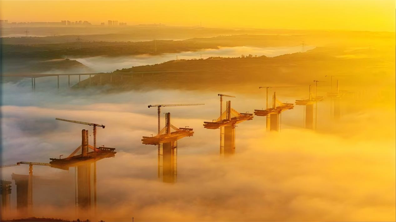 晨光初现,建设中的桥梁在薄雾中若隐若现,跨越河流、连接两岸,为陇东大地经济腾飞插上翅膀。