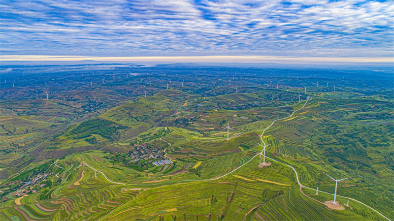 梯田蜿蜒起伏,乡村狼籍有致,云海连绵不绝,风车悠然旋转,织就了人与自然和谐共生的美丽画卷。