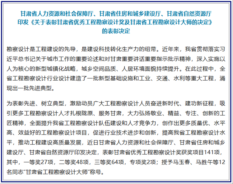 5ÔÂÖÐÑ®£¬Ê¡ÈËÁ¦×ÊÔ´ºÍÉç»á°ü¹ÜÌü¡¢Ê¡×¡·¿ºÍ³ÇÏ罨ÉèÌü¡¢Ê¡×ÔÈ»×ÊÔ´ÌüÓ¡·¢¡¶¹ØÓÚ±íÑï¸ÊËàÊ¡ÓÅÐ㹤³Ì¿±²ìÉè¼Æ½±¼°¸ÊËàÊ¡¹¤³Ì¿±²ìÉè¼Æ¾Þ½³µÄ¾ö¶¨¡·£¬¸ÊËàAGÑÇÓ鼯Íż¯ÍÅ38Ï²ìÉè¼ÆÏîÄ¿£¨×÷Æ·£©»ñ¡°¸ÊËàÊ¡ÓÅÐ㹤³Ì¿±²ìÉè¼Æ½±¡±£¬ÆäÖÐÒ»µÈ½±9Ï¶þµÈ½±16ÏÈýµÈ½±13ÏëÃ÷Ç¿¡¢ÀîÖлԡ¢ÕÅÁë¾þ»ñ¡°¸ÊËàÊ¡¹¤³Ì¿±²ìÉè¼Æ¾Þ½³¡±³Æºô¡£