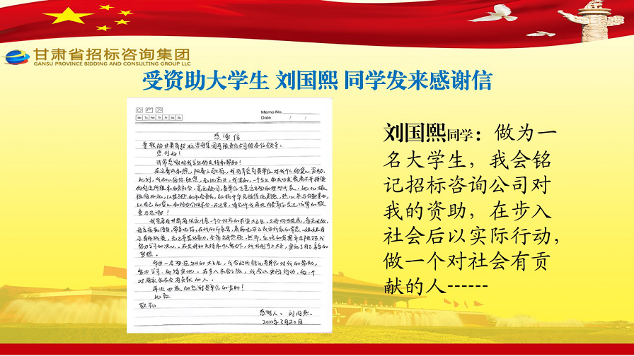 近日 ,张家川县张棉驿乡张棉村贫困大学生代表刘国熙、周长斌、李雪峰等向甘肃省招标咨询集团有限责任公司发来谢谢信 ,就招标咨询集团给予学费资助一事表达他们的谢谢之情。