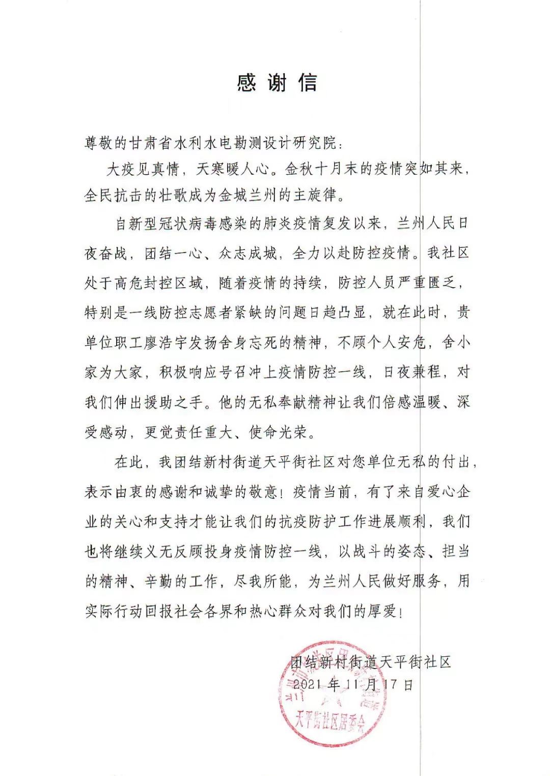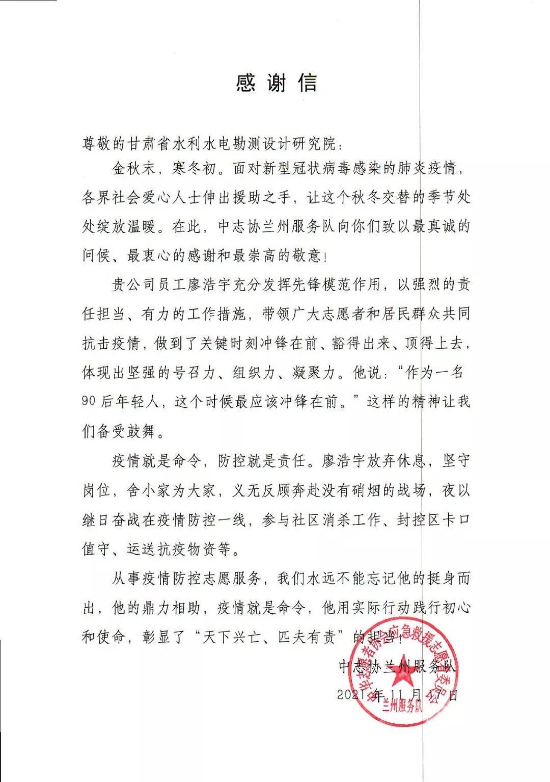 近日 ,水电设计院收到中志协兰州效劳队和团结新村街道天平街社区发来的谢谢信 。信中对水电设计院计划院员工廖浩宇在此次疫情爆发后 ,主动请缨加入疫情防控效劳事情 ,甘当疫情防控最美逆行者 ,连续坚持26天志愿者效劳的先进事迹体现谢谢 。