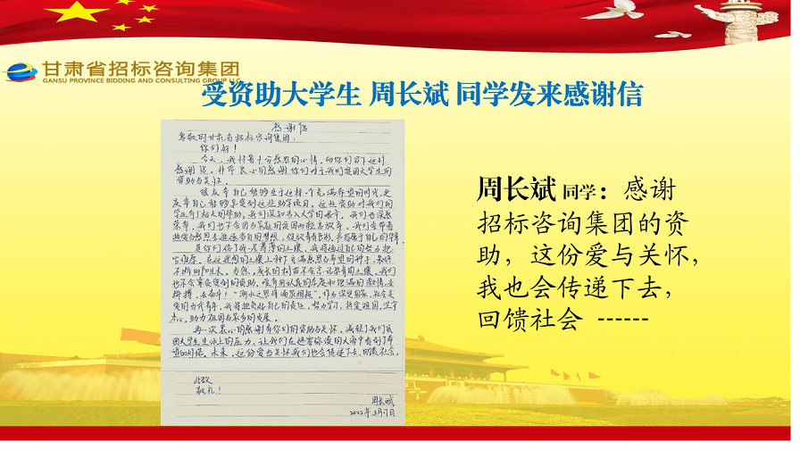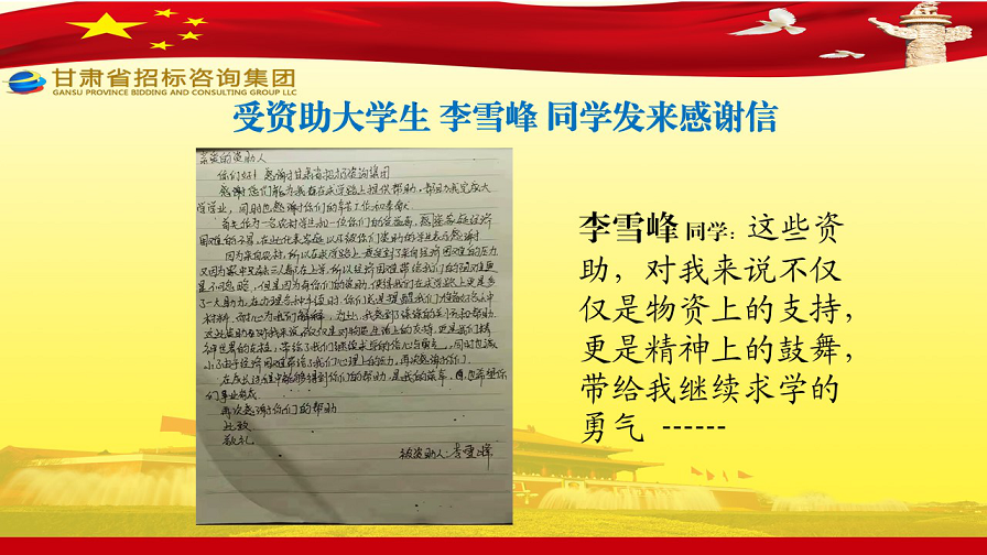 近日,张家川县张棉驿乡张棉村贫困大学生代表刘国熙、周长斌、李雪峰等向甘肃省招标咨询集团有限责任公司发来谢谢信,就招标咨询集团给予学费资助一事表达他们的谢谢之情。