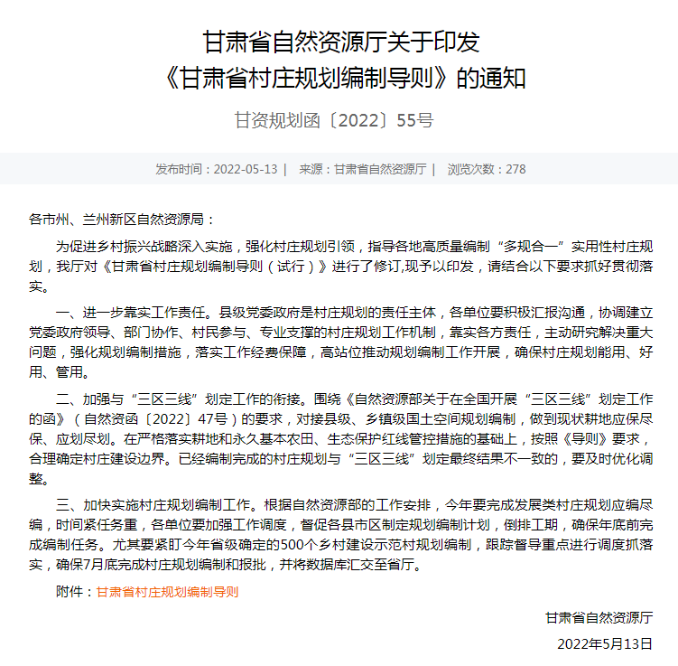 为深入贯彻习近平总书记视察甘肃重要讲话和指示精神,落实省委、省政府关于乡村计划事情安排,促推乡村振兴战略深入实施,指导各地高质量体例“多规合一”实用性乡村计划。近日,由甘肃省自然资源厅牵头组织,甘肃省城乡计划设计研究院有限公司加入起草的《甘肃省乡村计划体例导则》正式印发实施。