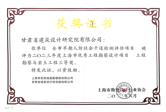 本次获奖项目由省建筑设计院检测中心联合上海市民防地基勘察院有限公司,就兰州市七八十年代人防社会干道开展检测鉴定。项目获奖,彰显了省建筑设计院在工程勘察设计和检测鉴定方面的立异能力和技术水平,也是对公司检测业务板块整体运营效率、综合效劳能力的再一次肯定。