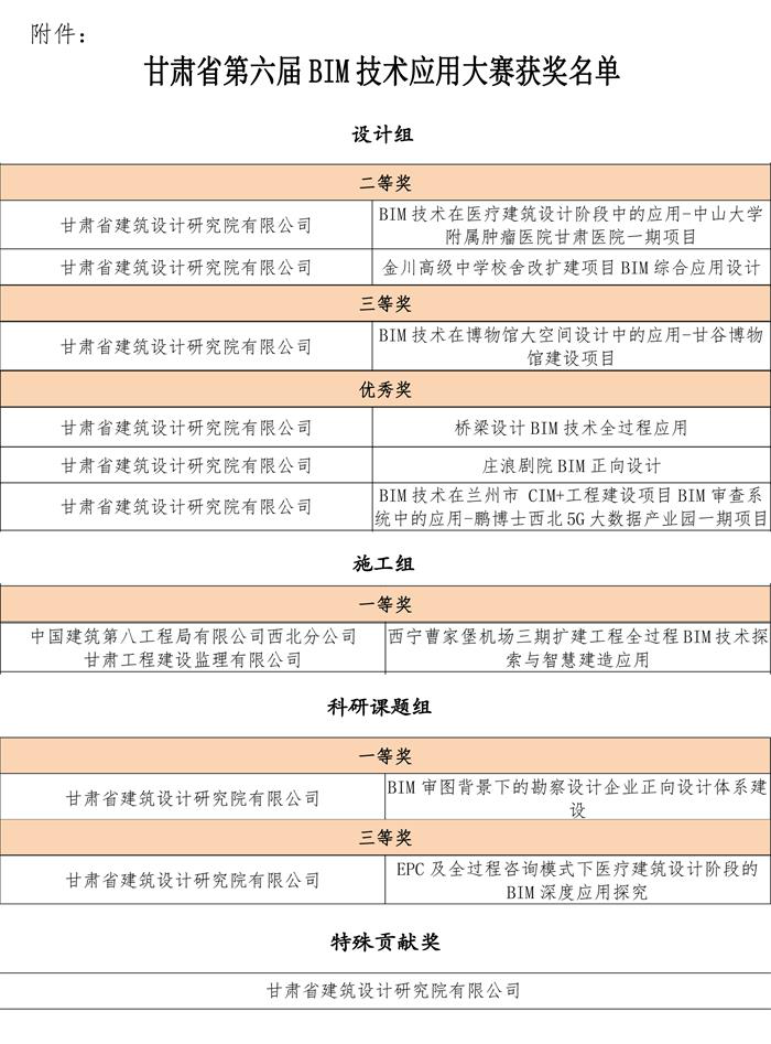 省建筑设计院荣获甘肃省第六届BIM大赛 十项大奖