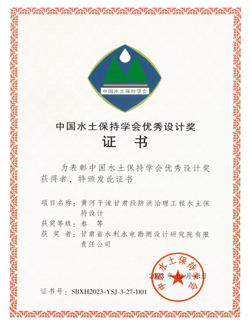 据悉,这是继《甘肃省引洮供水一期工程水土坚持设计》获第三届中国水土坚持学术大会优秀设计二等奖后,再次喜获此奖项。中国水土坚持学术大会制度自2018年建立以来,中国水土坚持学会搭建了我国水土坚持领域规模最大、水平最高的学术交流平台,现已成为中国水土坚持学术交流的重要品牌。中国水土坚持学会优秀设计奖每两年评选一次,主要奖励我国在水土坚持计划与设计领域中技术先进、效果显著、理念立异的项目结果。