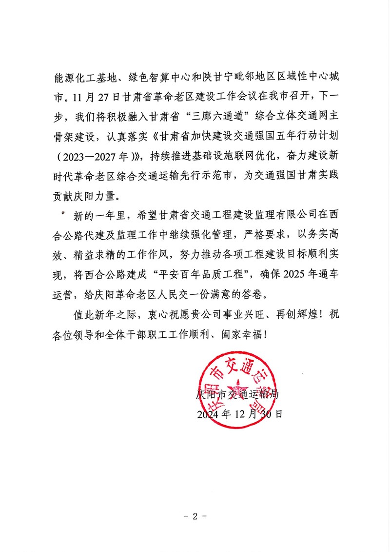 12月30日 ,甘肃AG亚娱集团集团收到庆阳市交通运输局的谢谢信 ,向省交通监理公司在G309线合水(老城)至西峰段公路项目建设历程中作出的孝敬体现谢谢。