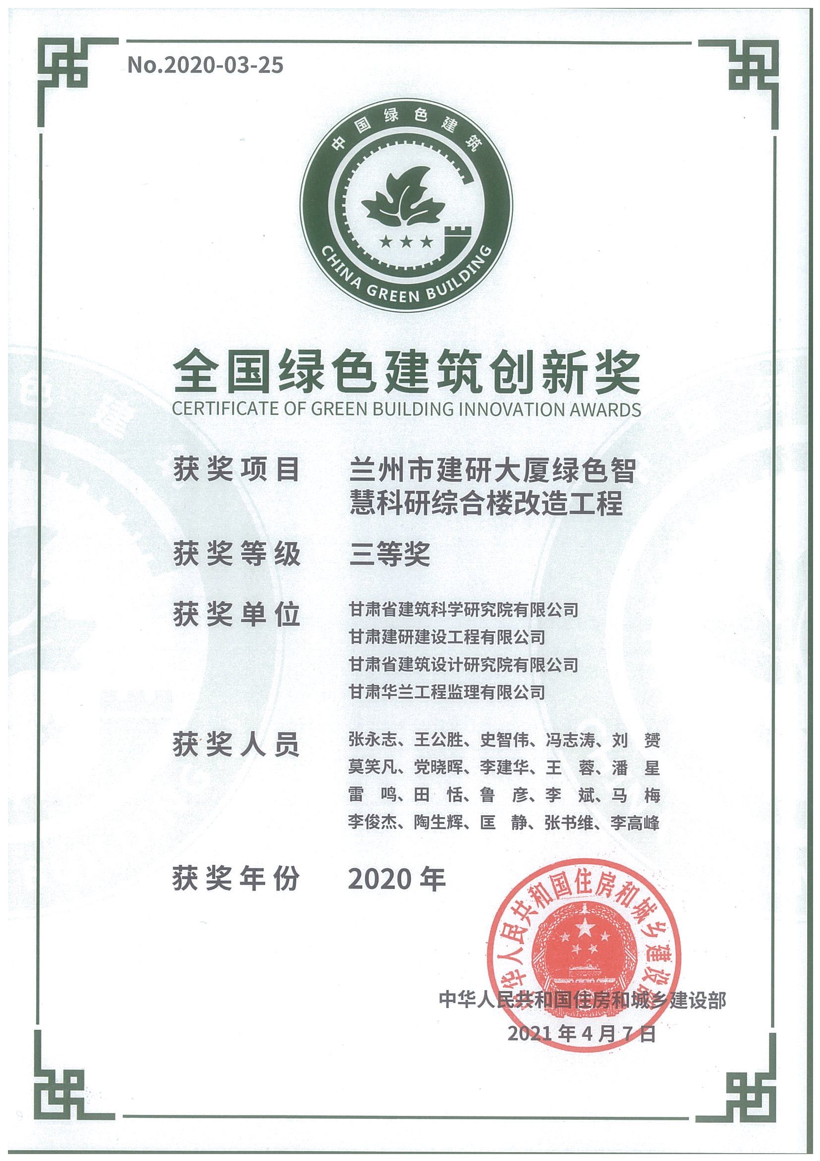 全国绿色建筑立异奖(兰州市建研大厦绿色智慧科研综合楼革新工程)